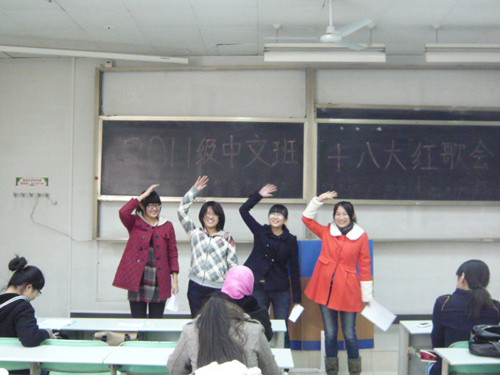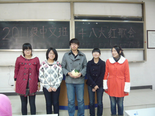 11月28日 下午,我院2011级汉语言文学专业以“十八大”为主题的团日活动,以“红歌会”的形式,在修远2206教室举办并成功召开。