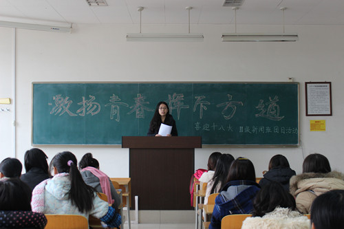 11月28日上午10:00,我院2011级新闻班以“喜迎十八大”为主题的当众演讲团日活动在明远一区1303教室顺利展开。