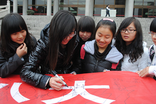11月22日早上7点,当天空还未完全亮时,我班全体33人就已经在学校南门口集合完毕。班长点完名后,同学们一起排着队去等公交车。几分钟后公交车到了,大家自觉地有序排队上车,车上互相礼让,女士优先,这充分体现了一名大学生应有的素质。大约三十分钟后公交车到站,我们换乘了地铁,班委组织买好地铁票,带领同学们排队候车,并井然有序地上车。很快就到了陕西省历史博物馆的门前,当时的时间为八点半多,博物馆的门票还没有发放,同学们便自发地站成两队,这期间同学们的心情都很激动,因为马上就可以与陕西文化有亲密的接触。之后我们将活动横幅“青春耀团旗,建功十八大” 拉了起来,同学们默念着口号,心中有激动的血液在流动。同学们自发的对祖国的热爱之情引起了许多路人的驻足观看,有些人上前询问我们的活动,我们向他们热情解释并争取他们的支持,他们对我们的活动给予了积极的评价,并和我们一起把名字签到横幅上,留作纪念。进馆之前我们班全体成员在门前拍照留念,大家脸上的阳光与自信和横幅上的字相辉映,是爱国之情让青春更飞扬。进馆后大家跟随着讲解员仔细地了解每一个展品后所蕴藏着的深厚文化,从第一展厅到第三展厅,每一件展品都向我们展示了西安跨越千年的历史文化积淀。参观大约进行了两个小时,同学们都被这绚烂多彩的文化所吸引迟迟不肯离开。全体同学在一楼大厅集合后,我们又一次拉开横幅,并向参观博物馆的人们讲解了我们的活动,他们都非常支持我们,纷纷签名纪念,当然也有许多国际友人被我们的活动所吸引,我们用英语和他们交流,他们也被我们的热情所感动,当即在横幅上写下自己的名字。有一名法国友人,由于身高原因,甚至单膝跪地为我们签名!我们看到的是他的真诚,更是对我们最大的鼓励!这让我们认识到我们的祖国是一个友好之邦,我们与世界各国的友谊也将愈来愈深厚。之后,我们还遇见了西安工业大学的同学,他们将当支部活动的地点也定在了陕西省博物馆,趁着这次难得的机会,我们和兄弟学校的的同学们愉快的合影留念。随后,我们步行去了环境幽雅,学风浓厚的长安大学雁塔校区,班主任为我们召开了主题班会。至此我们班的团日活动圆满结束了。