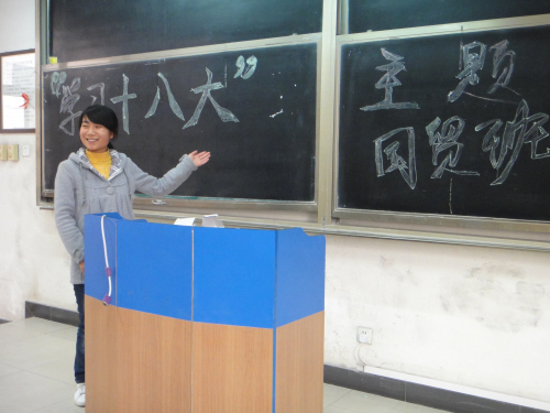 那是经管学院10级国际经济与贸易专业的同学们为迎接党的十八大,举办的“喜迎十八大,走进我们身边的人”主题团日活动。首先,“学习十八大”主题班会上,团支书带领大家学习党的十八大精神,了解科学发展成就。随后,他们以“喜迎十八大,走进我们身边的人”为主题拍摄短片,以短片形式走进身边的教师、学生和员工,听大家谈学习、梦想和工作,全方位的展现大学生活。