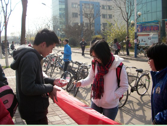 26日当天中午,我们同学上午上完四节课后在树蕙园西侧广场搭起了帐篷,女生购买了礼品,一些同学去把自己的模型搬过来展示。午饭后正是人潮高峰期,我们挂起了横幅,耐心的给过往的同学宣传我们的团日活动。也有同学对我们的模型很感兴趣,班级讲解员给他们讲解了每一个模型的特色。过往的学生都对我们的团日活动十分感兴趣,于是纷纷在条幅上签字,表示支持我们的活动。