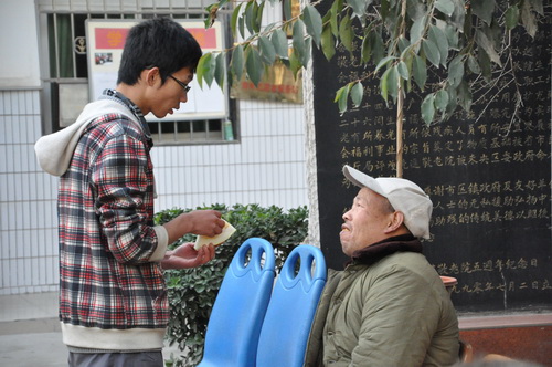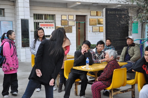 在下了公车又步行了四十余分钟后,我们终于来到了草滩敬老院。同学们一看见和蔼慈祥的老人们便倍感亲切,很快就把路途的辛苦抛在了脑后,积极的干起了各种为老人服务的活动。女生们为老人们刨起了水果,男生们则为老人们的起居和活动的地方打扫起了卫生。当大家又聚在一起时,我们与老人们共同表演起了娱乐节目。老人们兴致颇高的唱起了记忆中那悠扬绵远的歌谣,而我们这些来自五湖四海的同学们也为老人唱起了各自家乡的民歌、红歌、军歌和流行歌曲;还有同学为老人们表演起了乐器、给老人跳起了欢快的舞蹈……