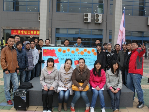 在前期的准备过程中,无机二班的同学被分为三个小组,分别负责不同的活动任务。5日晚,展板、横幅、宣传海报、都已准备完毕。本次活动分为两部分进行。11月6日上午11点, 活动第一个部分“红色宣讲”在渭水校区东区食堂树蕙园广场正式拉开序幕。11时活动正式开始,无机二班全体成员在团支书刘雷同学的带领下进行宣誓仪式,表达大家对祖国的热爱之情。紧接着进行的红色宣讲,更是号召了大家坚定的理想信念,唱响“科学发展辉煌成就”的主旋律。为了增强活动参与度,在现场也插入了一些文艺节目:唱歌、拉小提琴、拉丁舞等,除此之外还进行了党史知识竞赛,让同学们能在愉快的氛围中了解十八大,认识国情, 同时激发大家的使命感和责任感。活动现场和谐有序,大家乐在其中。13时许,在全体同学的努力下活动圆满结束,无机二班全体同学与前来关注本次活动的11级辅导员刘珺老师和12级辅导员况栋梁老师以及现场同学合影留念。