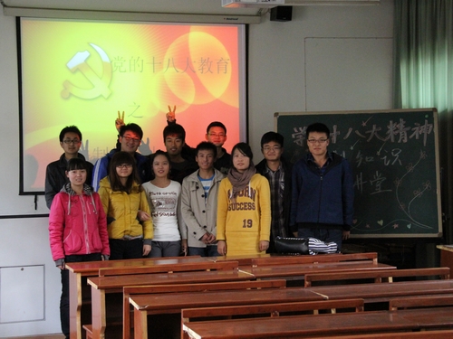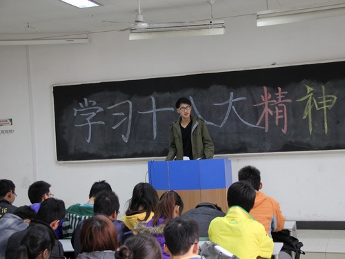 11月20日上午10点 活动一“十八大精神 在我心”分别在渭水校区修远教学楼3306教室为本次系列活动正式拉开序幕。之前全班级同学被分为四个小组,负责不同的活动任务。19日晚10时前,展板,横幅,一应俱全,所有宣传工作都已完毕。第一小组在我院(7号、10号、16号)每个宿舍楼下挂小板报,在食堂西侧门口放置大板报。11日早8时,班级宣传小组在申请的教室绘画黑板报,所有前期准备工作都有条不紊的进行着。10时活动正式开始,首先由班长对同学们进行十八大教育,全班同学集体学习了十八大精神,对国家实事及时了解,使整个班集体像注入了血液般激情澎湃,讲话结束后,教室中响起了热烈的掌声。接着,11级高分子班全体同学高举宣传板,横幅,在修远大道沿路宣传十八大精神,顿时成为我校一条亮丽的风景线。13时许,在全体同学的努力下活动一圆满结束,高分班全体同学在修远湖畔紧握右拳庄严宣誓:“我爱祖国的每一缕阳光,我爱祖国的每一寸土地……不论我身在何地、人在何处,我身上始终流淌着祖国的血液——生不能改,死不能变。为了这一切,我用我的生命承诺,我用我的荣誉宣誓:我爱我的祖国!”