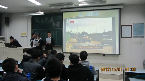 晚上6:30,各考场主持人宣布了比赛规则,及选手应注意的事项,接着决赛正式开始。比赛共分为“小试牛刀”、“勇抢当先”、“生死决斗”、“一决胜负”四个环节。比赛每个环节都是激动人心,参赛选手积极思考,踊跃参与,展现出了长大学子活跃的思维,过硬的实力和广阔的知识面。经过激烈的角逐,最终蔡烨这一组以雄厚的实力夺得本次大赛冠军。