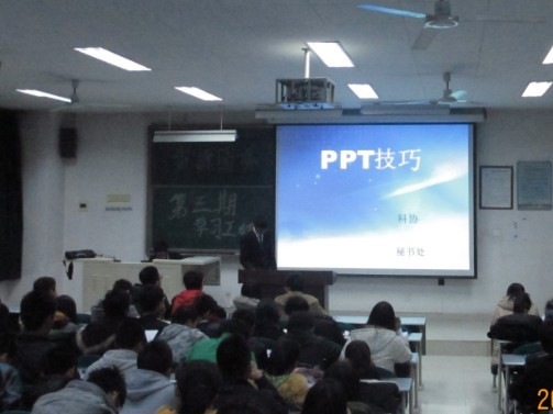 本次学习工程以软件学习为主,具体包括PPT的技巧及PS的学习。首先秘书处以PPT讲议方式为大家讲解PPT技巧,大体有幻灯片的建立、插入文本框、添加超链接等内容,让同学们对PPT有了初步的了解。
