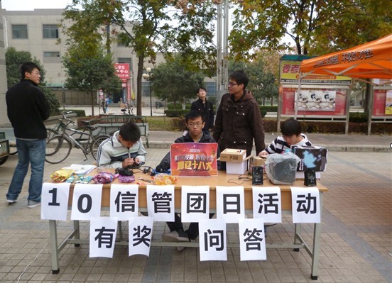 2012年11月25日,我班迎“青春要团旗 建功十八大”主题,展开了团日活动。我班与当日中午在滋兰苑广场门口摆放桌椅、电脑、音响等设备。并带来了事先准备好的有奖问答抽奖盒,盒内装有我们针对“十八大”而设立的问答题,并带了相应的小礼品,以提高活动的参与性与趣味性。