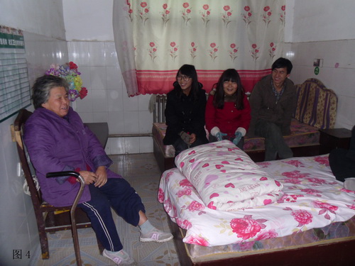 我们骑自行车去了敬老院。到了敬老院,两个人一组陪老人聊天,和他们一起唱歌,下棋,讲故事,其中有一老奶奶特别喜欢陕北民歌,《兰花花》.《打靶归来》等,之后我们去了他们的多功能厅,好像是一个开会的地方,但桌子上满是尘土,我们们帮满打扫了一下,还有几个老人在院子里下棋,但他们拿棋子的手好吃力,我们帮他拿,他在旁边指挥。最后我们一起合影。到四点多我们要离开了,他们都非常感谢我们,而且嘱咐我们好好学习。