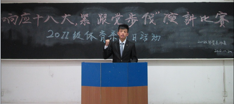 做完前期必要准备后,2012年11月20日七八节课,体育系2011级全体同学在修远3303教室举行了“响应十八大,紧跟党步伐”演讲比赛。