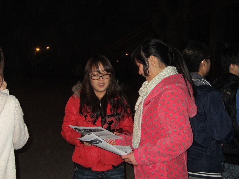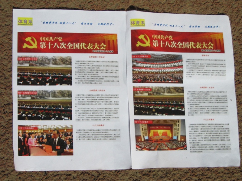 在该演讲比赛结束后,体育系班委又乘热打铁,在同学们高涨的激情与昂扬的斗志下,组织全班同学于当天(2012年12月20日)晚上,在东区足球场及体能测试中心,趁全校大三、大四同学在进行体能测试而人员极度集中的机会,给大家发放“十八大”会议相关议程和最新会议动态。