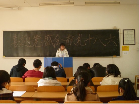 经管学院交通运输管理二班于2012年12月5日开展了以“喜迎党盛会,献礼十八大”为主题的团日活动。活动的主要对象是在校师生,通过主题班会的形式让同学们学习十八大的精神,通过唱红歌“没有共产党就没有新中国”来表达对十八大召开的支持。通过视频“十八大你最关注什么”的拍摄,了解全校师生对十八大的关注程度和关注内容,谨以此片献礼十八大。