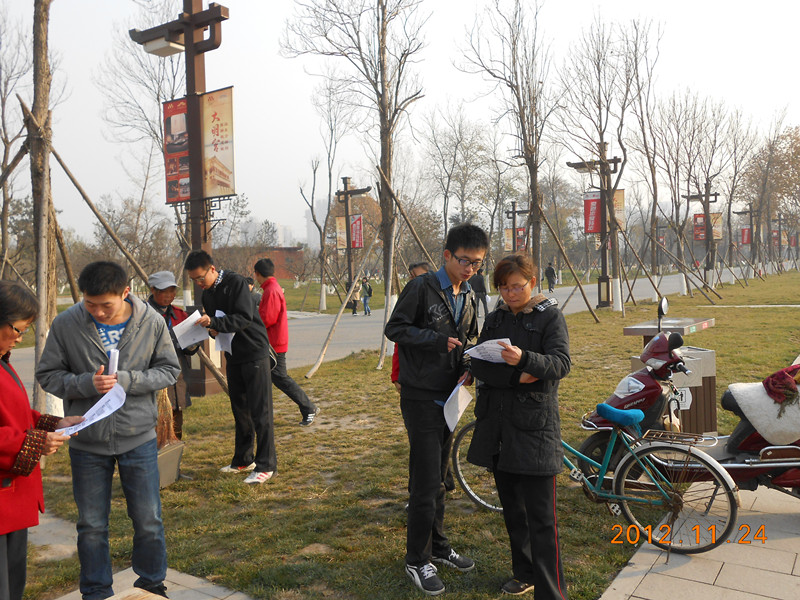11月24日上午,2012级矿物加工工程2班全体团员来到大明宫国家遗址公园。首先,团支部书记孙立鹏同学发言,就向群众宣传讲解十八大相关细节做了讲解。随后,大家积极投入到行动中,一边向公园群众分发宣传单一边与群众交流探讨十八大精神。接着是知识竞答环节,同学们积极参加“十八大知识竞答”,并带动群众积极参加,我们向参与竞答的群众发放了准备的奖品。这个环节结束后群众和同学们对十八大的了解更加细致深入。接着我们唱起红歌来表达对党和祖国的无限热爱。一首首红歌唱得大家心潮澎湃。最后,为了践行中共十八大中新提出的“生态文明建设”的内容,我们从细微处做起,做起了环保卫士,帮助公园内的清洁工打扫公园卫生。