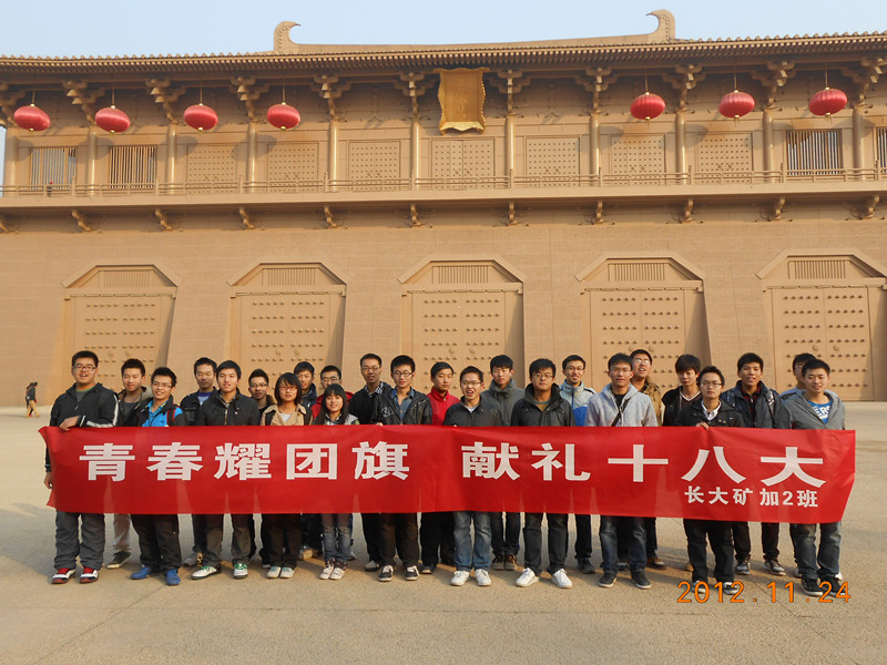 2012年11月24日上午,资源学院2012级矿物加工工程2班“青春耀团旗 献礼十八大”主题团日活动在大明宫国家遗址公园顺利开展。本次团日活动以十八大胜利召开为背景,旨在宣传中共十八大精神,使更多群众深入了解十八大,同时培养同学们的爱国情怀和与时俱进的思想。活动分四个部分有序开展:宣传讲解、知识竞答、高唱红歌、践行环保。