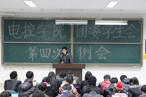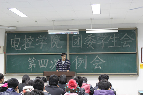 2012年12月8日晚7时,电控学院团委学生会在长安大学渭水校区明远3203教室召开第四次全体例会。本次例会的目的是对将于本月11号举行的“新电感应”迎新晚会做出详细的工作安排。出席本次例会的主席团成员有团委副书记凌尧、秘书长魏子尧、副主席郝一雄。会议由魏子尧主持。