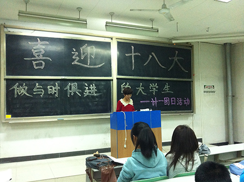 此次活动分为四个环节。首先,团支书张璐就“十八大”做出介绍,说明本次活动的主旨所在。然后,由宣传委员王丽彬下发党史材料,组织同学们学习中国共产党的发展历史,并由主持人韩青进行提问。随后,请6位同学上台,分成2组,进行唱红歌比赛。最后,集体听爱国歌曲《我爱你中国》。