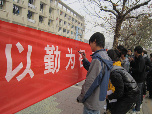 活动第三项,同学们在横幅上签字。横幅上“学以勤为径,考以成为本”的字样鲜明而有号召力,同学们在工作人员的指引下有序的写下自己的名字,许下承诺,诚信应考。