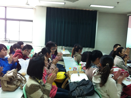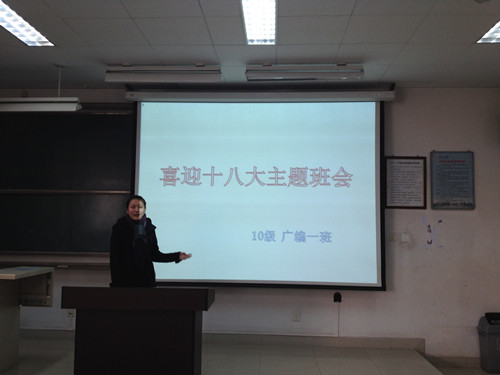 12月12日 ,我院2010级广编一班在明远3203教室,召开“深入贯彻学习当的十八大精神”主题班会,班会由宣传委员梅静主持,团支书在会上进行了铿锵有力的发言,赢得了在场所有人的掌声。