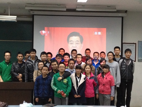 为庆祝党的十八大胜利召开,信息学院12级计算机四班于12月11日晚在明远1101教室举行了主题为“学习十八大精神”的团日活动。计算机四班全体同学参加了此次活动。