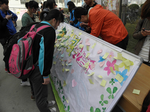 中午艳阳高照,使活动现场的气氛异常热烈。女生们在便利贴上写下自己的小愿望和相互的祝福,贴在制作精美的宣传板上,表达对学习生活的美好期盼。幸运抽奖活动也使现场气氛更加活跃。贴在宣传板上的小愿望,会由能够实现的人帮助女生们实现。比如帮忙辅导高数,帮忙修理自行车,找人一起去图书馆看书。这些都为我院男女生相互帮助,相互交流,共同进步架起了桥梁。