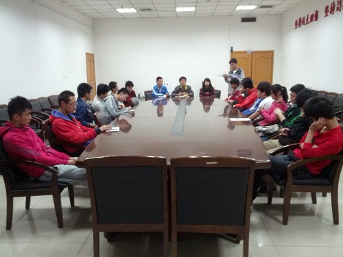 会议首先由文体部长李希成进行发言,他简述了此次“渭水杯”五人制足球赛的活动目的及意义,并对比赛氛围提出一定的希望。紧接着,文体部干事持抽签桶绕会议室进行抽签仪式,秉承公平,公正,公开的原则抽定了各个小组的比赛队伍并由副部长李博伟记录。之后,文体部干事刘洋为各个队伍的负责人宣布了此次比赛的规则。部长李希成提出了“友谊第一,比赛第二”的希望并回答了各个队伍负责人的疑问。最后,文体部与体育系协商了有关裁判的各项事宜。