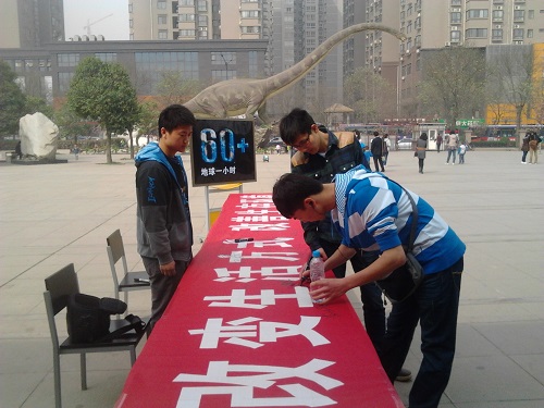 早晨8:00,机械青年志愿者服务队的4个志愿者在学校门口集合,集体前往陕西省自然博物馆。志愿者们在博物馆宣传地球日,拉出了“改变生活方式,改善生存环境”的横幅,请来往的行人了解地球日并签字,加深环境保护意识。今天是“地球一小时”活动日,现场气氛活跃,大家积极签名并了解地球日的意义,表示愿意在晚上8:30—9:30熄灯一小时,保护环境。