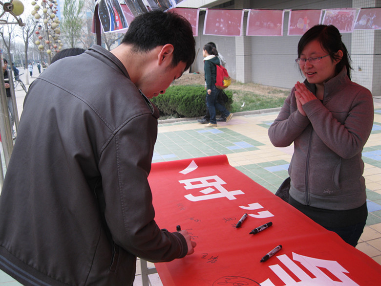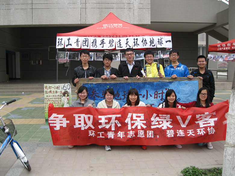 活动于3月21、22日在长安大学渭水校区东西区食堂门口进行了前期宣传,主要针对“低碳”、“环保”等话题进行了环保承诺签名,并向在校学生介绍“地球一小时”活动及其意义。本次活动的宣传阶段面对当前宣传单的大量浪费情况,我们本着节约、环保的原则,争取不发放一张宣传单,通过口头宣传和照片宣传以及志愿者进宿舍宣传的方式达到我们的宣传效果。