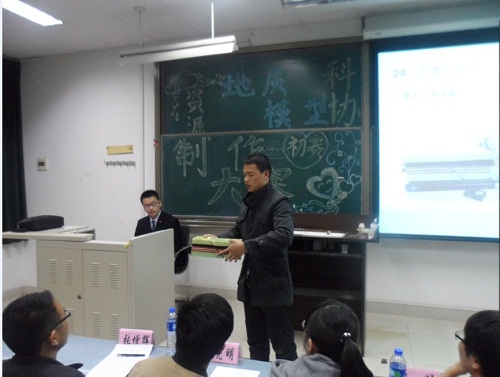 赛中,参赛队员们借助ppt对自己的模型进行生动详致的讲解,聆听过后各位评委根据作品提出一些问题,也给出宝贵意见。经过激烈的角逐,一部分参赛作品脱颖而出,得到了评委们的一致认可。最终,成功晋级决赛的队伍名单公布,资源科协主席王兴上台,对成功进入决赛的队伍表示祝贺,也对其他努力制作模型的参赛选手们表示感谢与鼓励。他总结到:“地模大赛是以‘提高创造性拓展知识面 考验动手力’为主题的比赛,不论结果如何,相信通过这次比赛,大家的地质知识水平、创新精神和动手能力都一定有所提高。希望大家都能够继续努力,相信努力就有收获。”