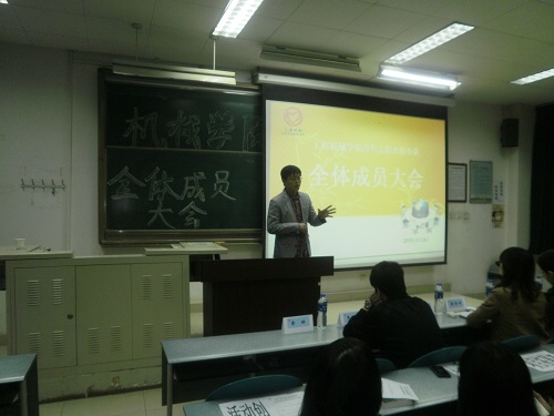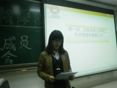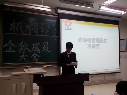 晚7:00,服务队全体成员到达会场,签到入座,大会在悠扬的歌声中正式开始。首先,工程机械学院12级辅导员朱先前老师做了发人深省的讲话。朱老师回顾了服务队的发展历程,对服务队的前期工作做出了评价和肯定,同时对于今后的活动提出了“创新、有特色、打造品牌”的要求。随后,朱老师就新闻稿拍照时远景和特写的技巧方法做了点播,并对我们本学期的五四评优给予了热切希望。大会第二项,主席段伶伶对上学期计划举行活动和实际举行活动做了汇报。第三项,全体成员表决并通过了新修订的服务队章程。第四项,大家投票筛选出了服务队的口号:“尽青年之所能,服务社会之所需”。第五项,各部门干事讨论交流了志愿者服务的相关议题,加深了大家对志愿者服务的认识。最后,此次大会还有一个别出心裁的活动——“跳槽”,队员们写下自己所在部门以及想要“跳槽”的部门,并注明原因。这个活动加深了队员们对各个部门的认识,为以后的合作做了铺垫。