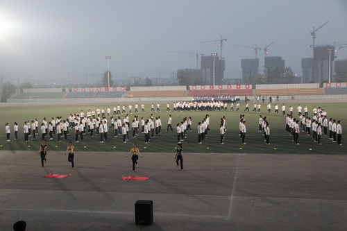 第一个出场的是我们建筑学院的同学们,随着音乐响起,大家从操场两侧依次以蛇形跑入中央,同时前排的四名女生翩翩起舞,独特的入场方式让大家眼前一亮。虽然我们只有两百多人,可在气势上并不输给其他学院。做操时大家精神饱满,动作整齐,娴熟到位,刚健有力,张驰有度,充分展示出青春的气息和学院的风采。为了这次比赛,他们早早就开始训练,投入了很多的精力。由于平时的苦练,终于功夫不负有心人,精彩的表演为他们赢得了一阵阵掌声。最后,大家在“挥洒激情,超越梦想,建筑学子,永创辉煌”的口号声中收队离场。