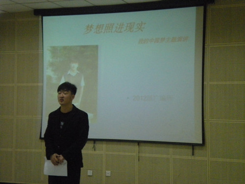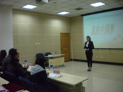 担任此次演讲比赛评委的有院团委书记朱冀州老师、12届辅导员乔基庆老师、团委副书记张建男、学生会主席张清雅。高雪主持比赛。此次演讲比赛的主题是“我的中国梦”。共有八位选手进入决赛,最后将评出三等奖三名,二等奖两名,一等奖两名和特等奖一名。