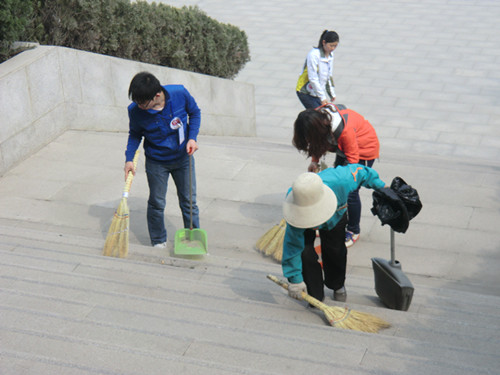 上午9点整我们来到城市运动公园门口。志愿者负责人先同这里的管理人员进行协商,取得他们的允许后,我们迅速展开了活动。我们所有的志愿者分成三个小组。第一个小组为宣传组,他们的任务是向人们宣传环保的重要性,告诉大家注意从节约,不乱扔垃圾等方面做到环保。第二个小组是慰问组,他们把我们带去的手套和口罩等慰问品送给了做环卫工作的叔叔阿姨们,并且询问了他们的工作情况,最后表达了我们的尊敬和感谢之情。第三组为捡垃圾组,他们不放过任何一处垃圾死角。11点30分所有的志愿者集中在一起,我们在环卫工人的带领下和他们一起打扫了体育馆。虽然灰尘很大,大家也很辛苦,但大家干得很带劲。