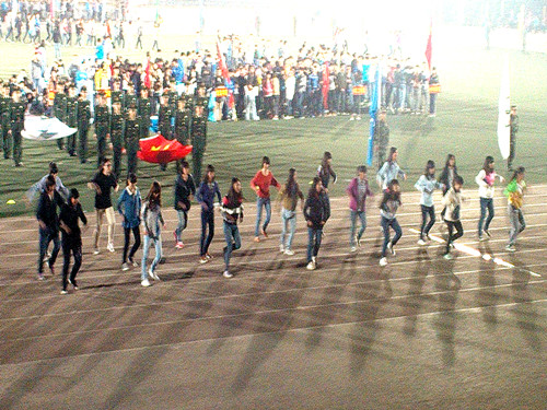 2013年4月7日,距运动会开幕还有3天,我院学生同全校师生参与开幕式彩排活动。彩排活动在老师们的安排下有序进行。
