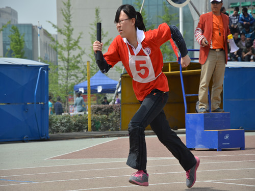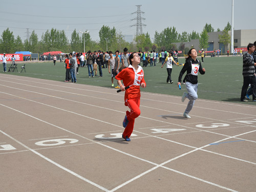 气氛热烈的男子接力比赛结束,女子接力紧接着开始。王胜男、李畅、白雪儿、王晓彤带着自信的笑容走上跑道。女生的飒爽英姿赢得阵阵喝彩。