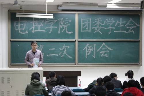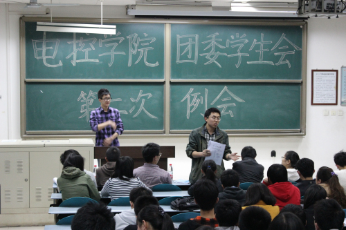 2013年4月9日晚7点,我院团委学生会在明远1303教室召开了本学年第二次全体例会。出席本次会议的不仅有团委副书记凌尧、主席丁智、常务副主席王若晨、副主席殷语晗、郝一雄以及秘书长魏子尧,而且种超老师也在百忙之中莅临此次会议。召开本次例会的主要目的是总结校运会准备工作以及对明天的2013届校级阳光运动会做详细的工作安排。例会由秘书长魏子尧主持。