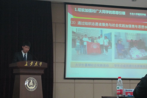 答辩会最后,校学生会主席李致中做总结性发言,着重强调了服务维权的重要性。在团队建设方面,特别对我院高度推崇,他说:“建筑学院作为一个人数不多的院系,仅40多人的学生会能办出 “建筑日”这样大型富有影响力的活动,让人感到非常震撼,为长安大学的优秀形象塑造做出了杰出的贡献!”