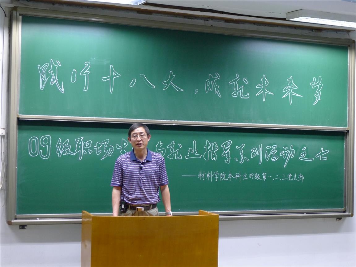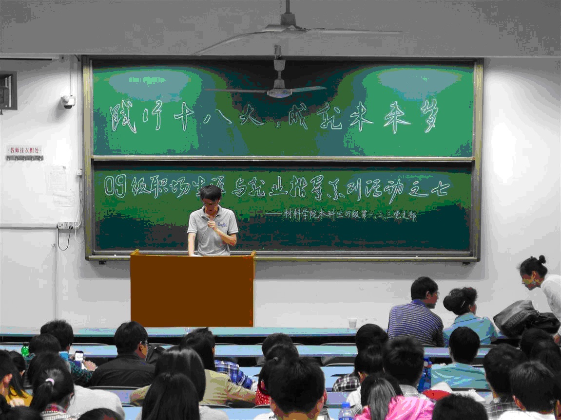 2013年4月15日晚7点,材料学院本科生09级第一、二、三党支部“践行十八大,成就未来梦——09级职场生涯与就业指导系列活动之七”在校本部七区271教室如期举行。我院党委副书记高雁北老师、09级辅导员林祖梅老师出席了本次会议。大会由09级第二党支部书记任梦主持。