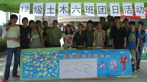 与宣传活动几乎同时,2012级土木六班“青春践行中国梦”团日搜集梦想活动于2012年4月16日在西区食堂东门顺利展开。本次团日活动既为迎合我校团日活动的开展,又旨提高大家对“实现中华民族伟大复兴,就是中华民族近代以来最伟大的梦想!”的“中国梦”的理解。