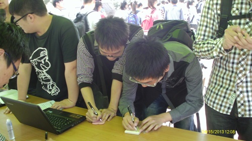 活动于中午12点准时开始,与宣传相结合,工作人员有礼貌地邀请同学,请他在便利贴上写下自己的梦想,然后工作人员将写好的梦想条贴上梦想收集板。各个同学都积极的参与进来,兴奋的写下了自己的梦想,现场气氛十分活跃。之后,六班同学打出“立中国梦想,建和谐社会”的横幅合影留念,此次搜集梦想活动到此结束。