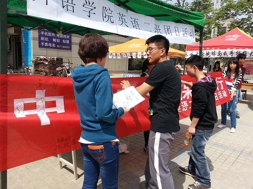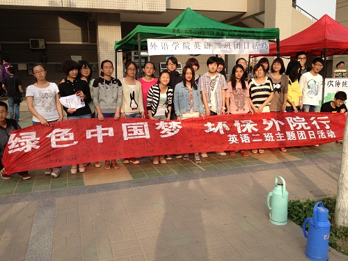 为深入学习宣传贯彻党的十八大精神,深入开展中国特色社会主义宣传教育,外语学院12级英语二班于2013年4月15日开展了“绿色中国梦,环保校园行”主题团日活动。
