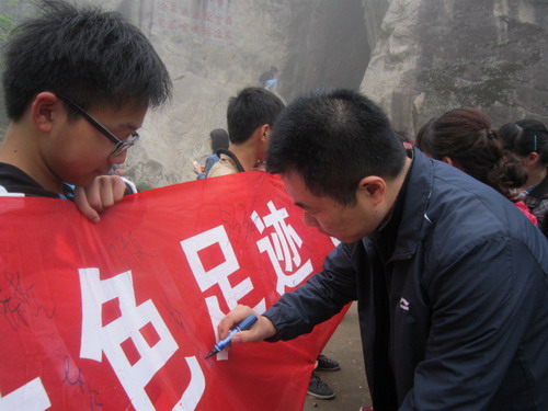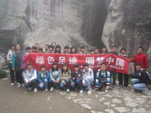 首先进行第一个活动:向景区垃圾说不!大家在爬山的过程中,认真捡拾山路两边的垃圾,为维护景区环境尽一份力。然后进行第二个活动:播撒绿色希望。大家在景点“冰风洞”前拉起了横幅,积极地向过往的游客宣传本次团日活动,邀请大家在印有本次活动主题的横幅上签名。作为感谢,我们向所有签名的游客免费发放经过我们精心挑选的种子。大家热情响应,使本次团日活动圆满顺利的举行。最后,大家举起横幅,一起喊出了口号:“绿色足迹,圆梦中国,造价一班在行动!”