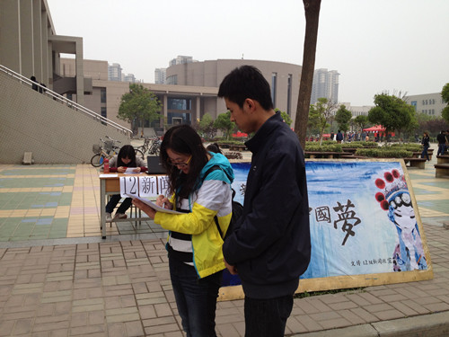 4月21日,12级新闻班全体同学在学校内外开展了以“新闻人·聚焦中国梦”为主题的班级团日活动。11:00同学们在东区树蕙园广场西侧摆放好桌椅和展板。此次活动采用问卷调查形式,就大家对“中国梦”的理解,对当下关注率最高的民生问题,对“中国梦”的理性建议等方面设置问题。经过广场的同学们都踊跃参与,积极填写问卷调查,与新闻班同学们交流想法。
