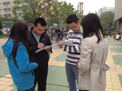 下午14:00开始,班长程忠孝带领全部男生和一部分女同学到学校南门外。为使调查结果具有真实性和广泛性,向小商贩和店主发放问卷。他们对同学们的活动表示支持。