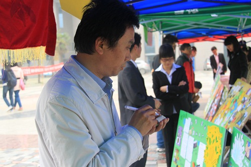 活动期间,资源学院党委副书记薛冬钧充分肯定了本次活动中各展板的内容,并对学院专业展示和其对我院学生起到的的积极作用给予了高度评价。面对美丽中国描绘和资源现状展览模块,薛书记在认真听取了解说员的讲解后指出:这样的展示对地球日科普知识的普及起到了很好的作用,提高了我校同学对地球日的关注度。当参观到雅安地震板块时,薛副书记亲笔在便签上写下了“为雅安祈福”五个字,寄托了自己对地震灾区的祝福与关心。