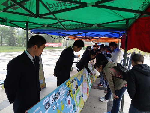 在本次地球日外展活动中,我院大力发扬创新精神,将活动分为美丽中国描绘、地球资源现状展示、学院专业介绍、地质灾害预防展示以及为雅安祈福五个模块进行了丰富多彩的宣传展出。在美丽中国描绘板块中,我们通过对美丽中国现景和远景的描绘,激发出同学们保护自然资源的意识;在地球资源现状展示模块中,我们深入剖析了国土资源现状,涉及方方面面,各行各业;在学院专业介绍模块中,我们细致的介绍了对我院个专业进行了详细地介绍,我院专业分为地质学、资源勘查工程(固体矿产方向)、资源勘查工程(石油与天然气方向)、旅游管理、资源环境与城乡规划管理、矿物加工工程、地理信息系统、土地资源管理共八个专业。各个专业都有各自的展板来展示本专业的特色,吸引了很多同学前来观看学习。