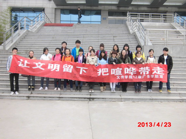4月23日,早10:20,文传学院2012级广告班全体同学在导员与团支书的组织下,齐聚逸夫图书馆前,开展了以“文明自习,分享宁静”为主题的团日活动。