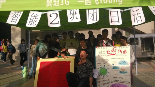 此次活动在当天17:30分在树蕙园广场西侧举行。活动前期,我团支部人员准备了海报一张、签名板一张、帐篷一顶以及横幅一条,悬挂于树蕙园广场四周。活动中,我团支部人员分为三个小组,进行宣传。第一小组同学发放印制的传单,并给过往的同学宣传相关知识;第二小组同学在帐篷内整理材料,邀请同学在签名板上签名,表达大家对预防H7N9的信心和希望;第三小组同学在海报和宣传板周围为大家讲解相关科学知识。此次活动于18:30分圆满结束,团支部人员合影留念。