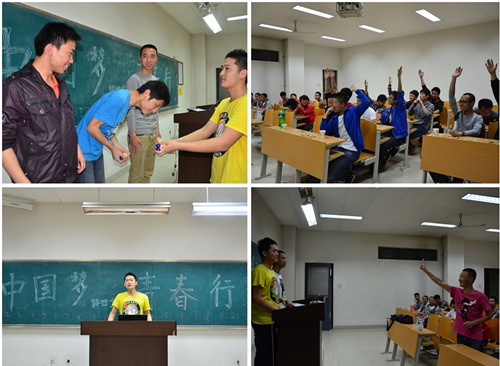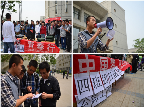 “中国梦,青春行”,2013年4月18日星期四2012级公路工程4班的团支部在西区食堂东侧拉开了以“中国梦,青春行”为主题的团日活动的序幕。
