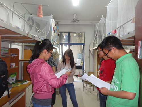 次日8:30,班长与团支书带领大家与楼管阿姨按照事先的计划对楼层进行清整,通过志愿服务,响应党中央习总书记的号召打造美丽中国梦,进一步推进宿舍文明建设,增强同学们环境意识,同时让同学们通过自己清扫楼道卫生,使同学们进行换位思考,增强大学生的大局意识、责任意识和奉献意识。与此同时,为应对频发的地震等自然灾害,支部同学也对宿舍的消防设施,安全通道进行了检查,确保灾难发生时,能及时有效地应对。中午,我们在东区树蕙园广场和西区滋兰苑发放事先设计的宣传材料,利用人流高峰进行宣传,进一步提升活动的影响力。下午4:00,支部成员在大学生活动中心颁发宿舍评比奖项,并合影留念。至此,我们班团日活动圆满结束。