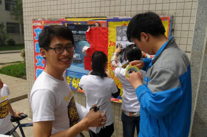 之后,同学们在各宿舍楼的宣传栏处贴上了自制的节能减排海报,许多过往同学见大家统一着装宣传,纷纷投来好奇的目光关注我们的活动。