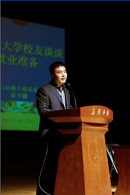 张宁骥校友以《与长安大学校友谈谈就业准备》为题,针对当前高校学生所关心的就业问题和社会热点问题展开,围绕国际国内总体经济发展形势、当前大学生面临的机遇与挑战、个人定位与择业、择业过程应避免的几个误区等方面做了详细地阐述。他还以自己丰富的人身阅历和工作经验,以鲜活生动的事例告诉在座的大学生要树立正确的择业观,要有劳动观念和劳动意识,尽早做好自己的职业生涯规划,树立信心,打牢专业基础,为就业做足充分准备。另外,他还就如何提升应聘的技巧等方面与学生进行了交流。
